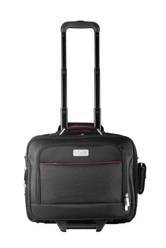 This case includes a removable slipcase, making it easy to transport your notebook to meetings. Jet black with handsome maroon accents and interior lining, the VAIO Rolling Notebook Case is good-looking and practical with sturdy silver hardware, a hideaway telescoping trolley handle, inline skate wheels and heavy-duty zippers and straps.The convenient storage includes a back compartment for overnight clothes and removable cell phone holder on the outside of the bag.